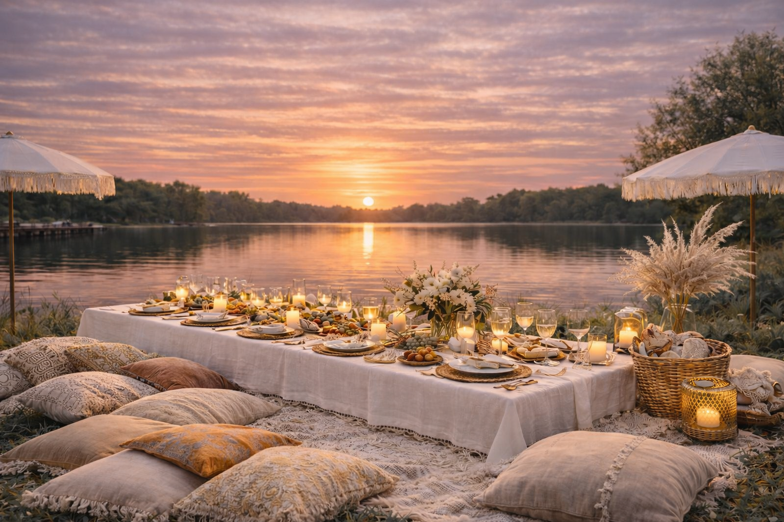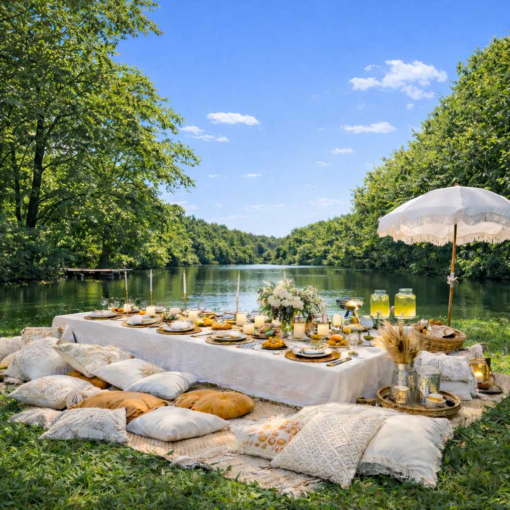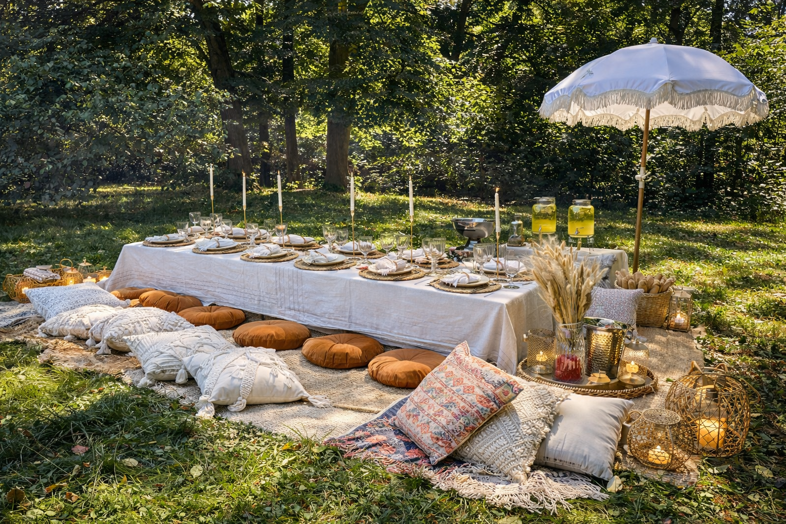 Picknicktische, Outdoorteppiche, Bodenkissen, Dekokissen, Geschirrset, Weingläser, Wassergläser, Trockenblumen, Stoffservietten, Elektr. Kerzen und stylische Deko.